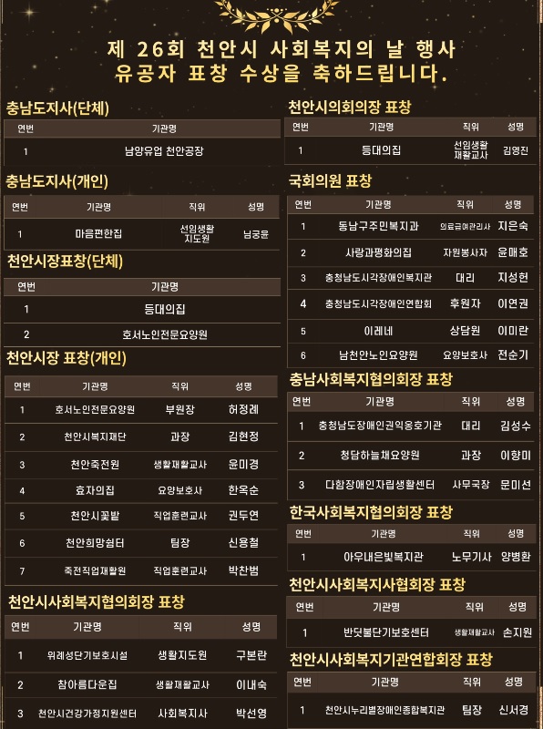 제 26회 천안시사회복지의 날 행사 유공자 표창수상 페이지 정보 작성자작성자 : 천사협 조회조회수 : 771회 작성일작성일 : 25-09-23 13:14 본문 수상을 축하 드립니다! 목록 다음글「제26회 천안시사회복지의 날 행사」사회복지 유공자 추천 협조 요청 25.07.28